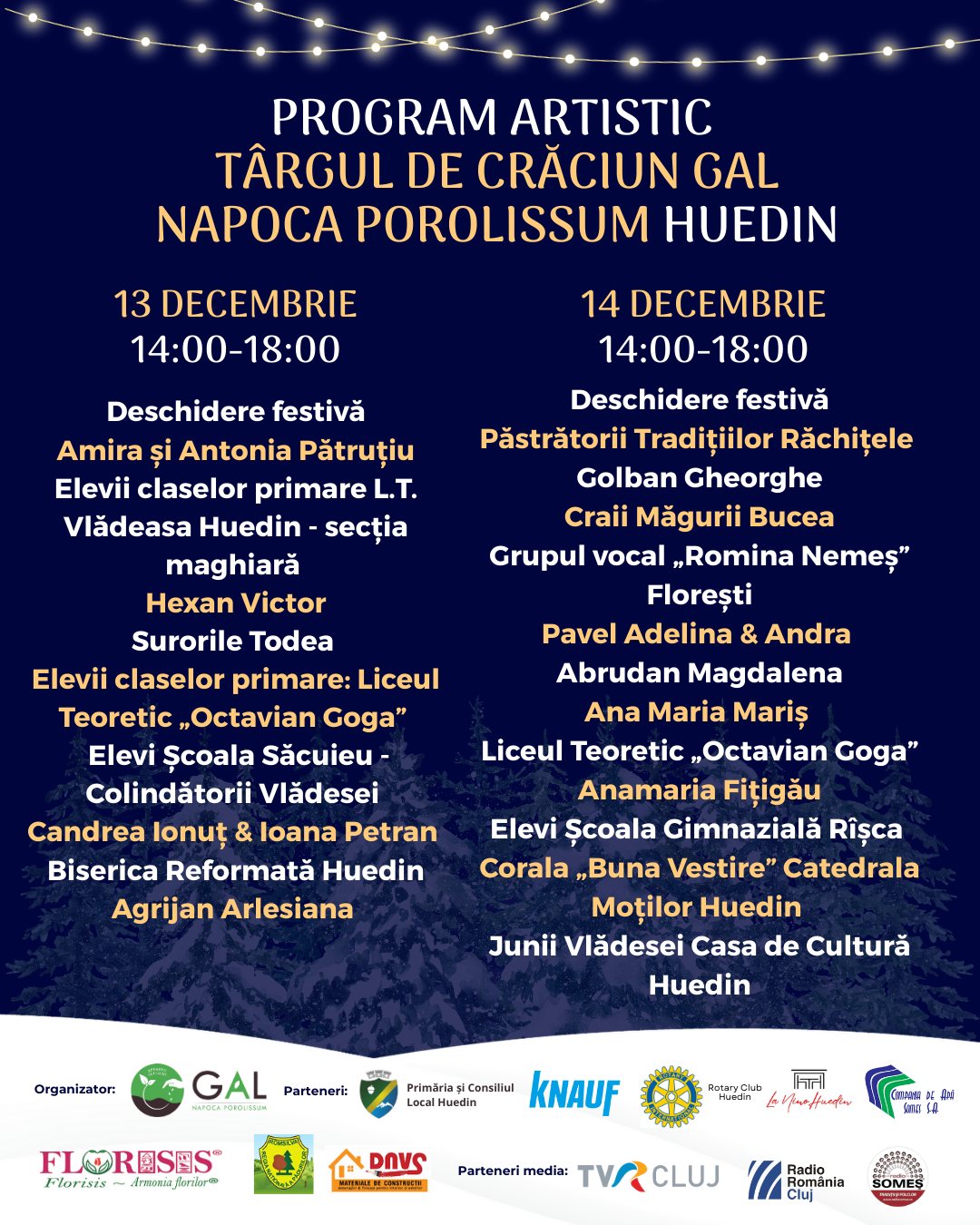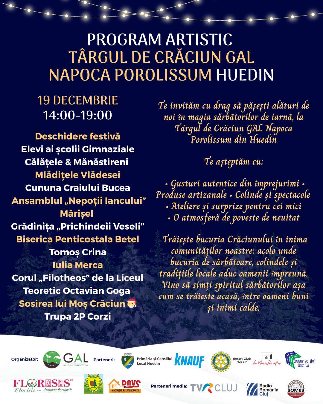 Târgul de Crăciun GAL Napoca Porolissum este organizat în parteneriat cu Primăria Huedin, alături de: